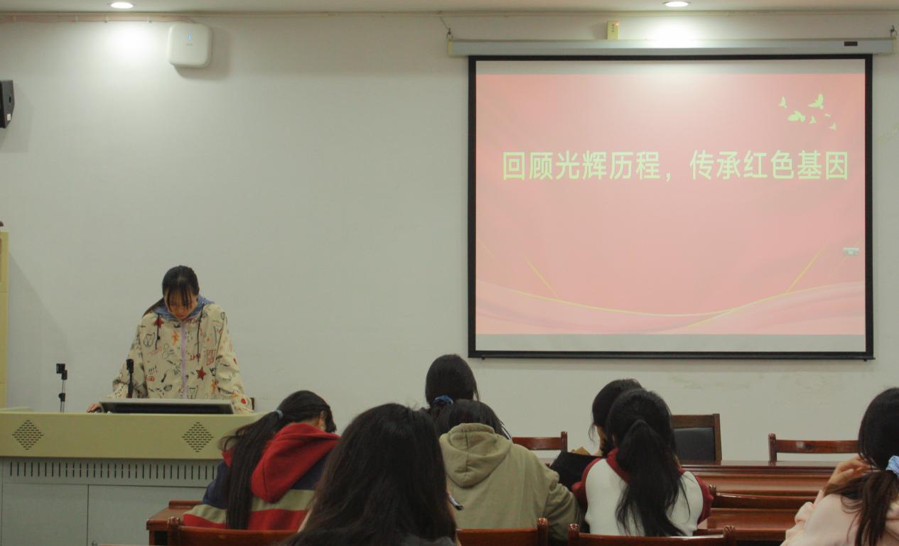 随后,雷雨凤同学聚焦“从建党到建国的历程与新时代红色基因实践”,系统回顾从建党到建国光辉历程,重点阐述新时代背景下红色基因在国家建设、社会发展、个人成长中的实践价值,强调红色力量是推动中华民族伟大复兴的强大精神动力,号召学生党员在新时代传承好、践行好红色基因。