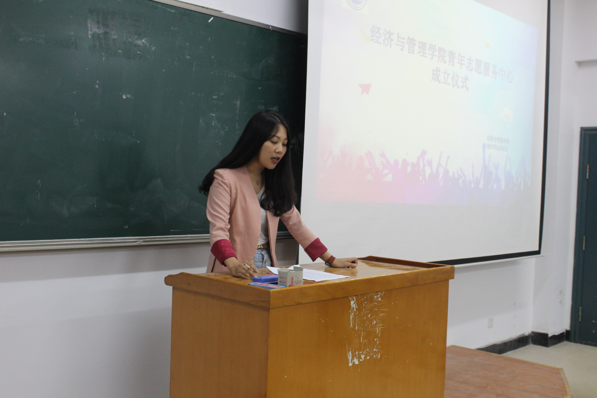 伴随着热烈的掌声,成立仪式拉开了帷幕。首先,由校青志中心主席陈阳同学宣读《关于成立经济与管理学院青年志愿服务中心》的批复文件。紧接着,学生代表王佳绮同学介绍了经管学院青志中心筹备的基本情况,她表示,经管学院青志中心借着共青团湖南理工学院委员会改革这股东风、结合学校共青团工作的发展方向,以及在学校党委的正确领导和校团委的指导下不断孕育,并严谨有序地进行着筹备工作。