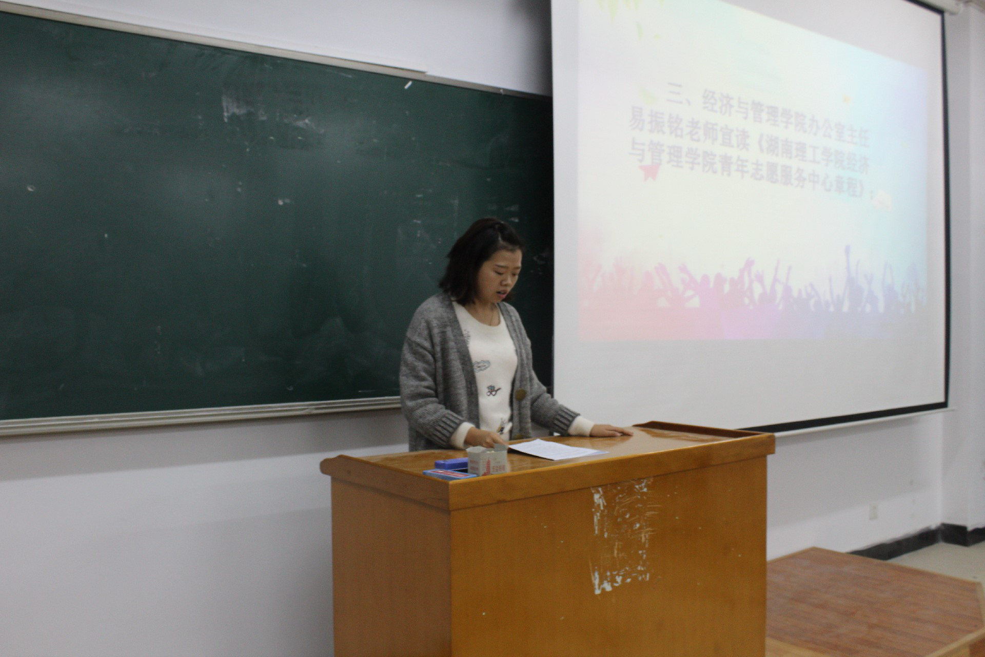 随后,易振铭老师宣读了《湖南理工学院经济与管理学院青年志愿服务中心章程》,她表示,经管学院青志中心旨在培养经管学院学子们的服务意识以及志愿服务实践能力,作为学校志愿者服务活动的组织者,将密切配合学校中心工作、维护同学的合法权益。