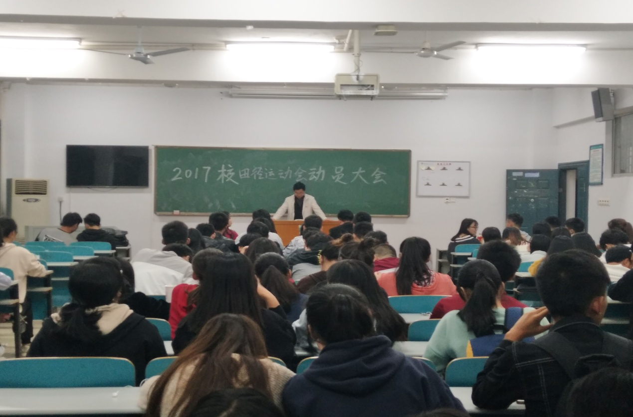 为迎接即将到来的校运动会,保证运动会的顺利举行,11月1日晚,经管学院在8410教室召开了2017年校田径运动会动员大会,经管学院党总支副书记刘敬龙、学生工作办公室主任易振铭、团总支书记叶亚男、2017级辅导员顾绍春出席了本次大会。