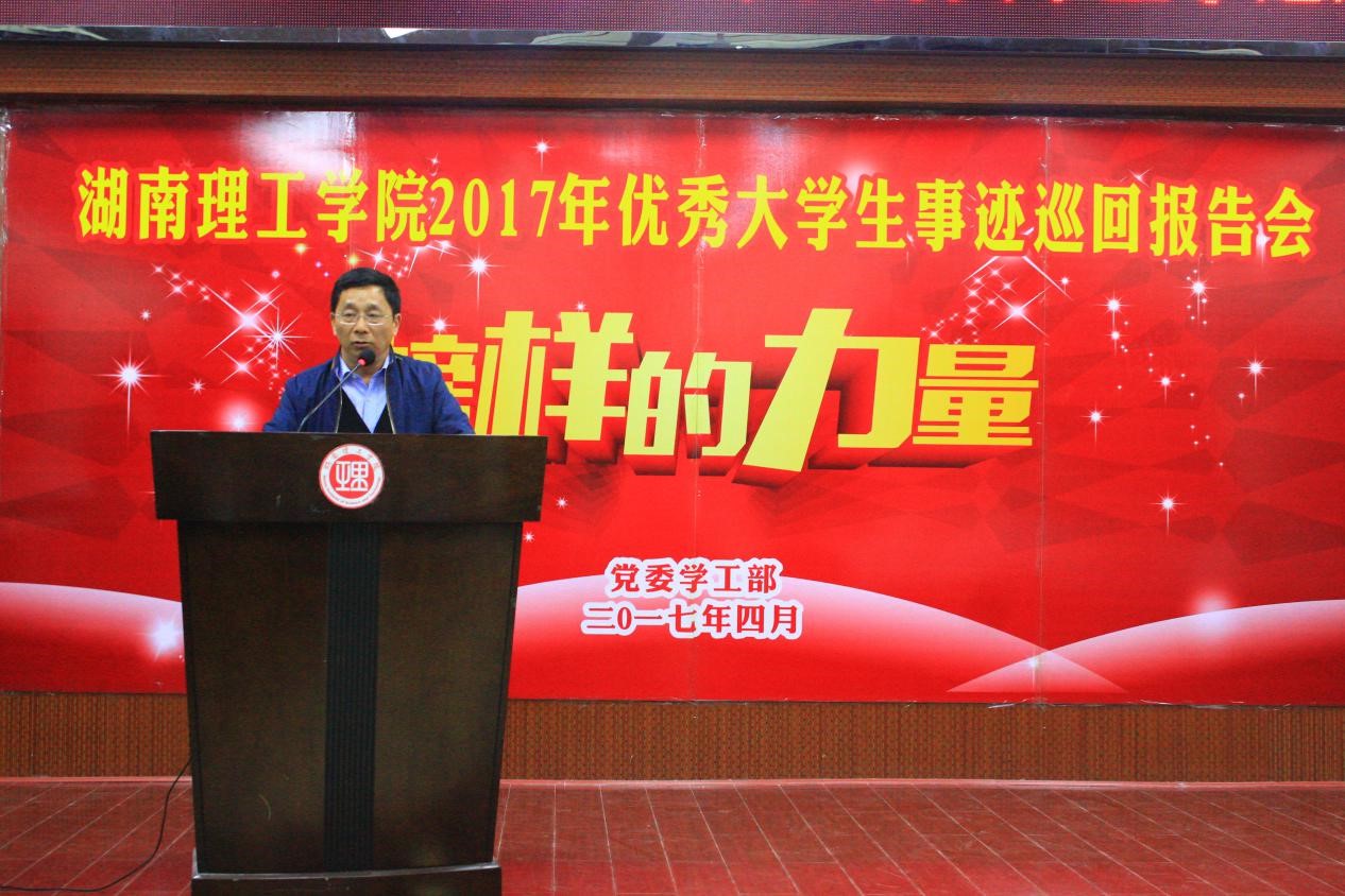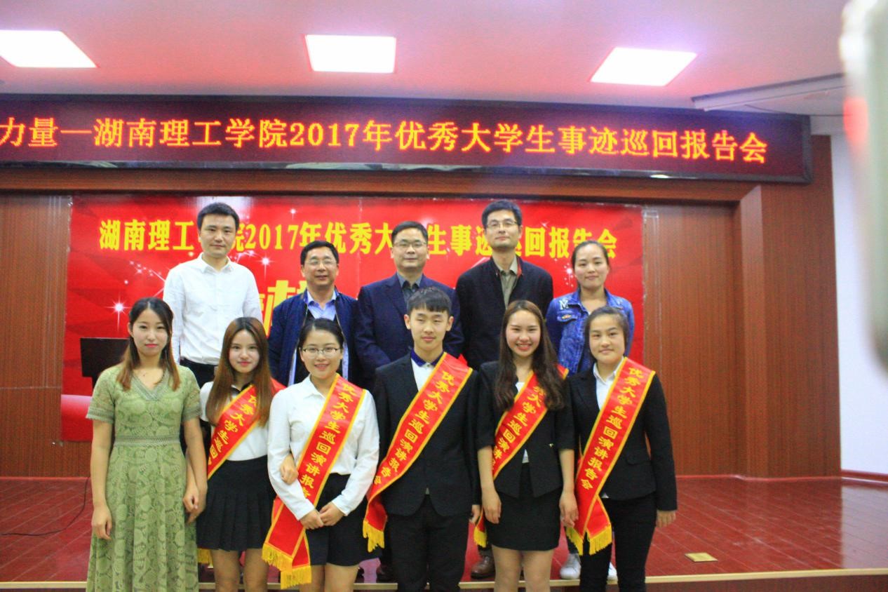 4月23日晚,经管学院与政法学院在学校南院6号教学楼学术报告厅联合举行了“榜样的力量”湖南理工学院2017年优秀大学生事迹巡回报告会(第二场)。校党委学工部副部长王云朋、政法学院党总支书记刘淳松、经管学院党总支副书记刘敬龙出席报告会,经管学院和政法学院的部分师生听取了此次报告会。经管学院学生甘玲、中文学院学生王思琪、物电学院学生刘妍、计算机学院学生卢杰及政法学院学生段林等五位优秀大学生代表分别在本场报告会上介绍了他们的优秀事迹。报告会由政法学院学生冯雪娟主持。